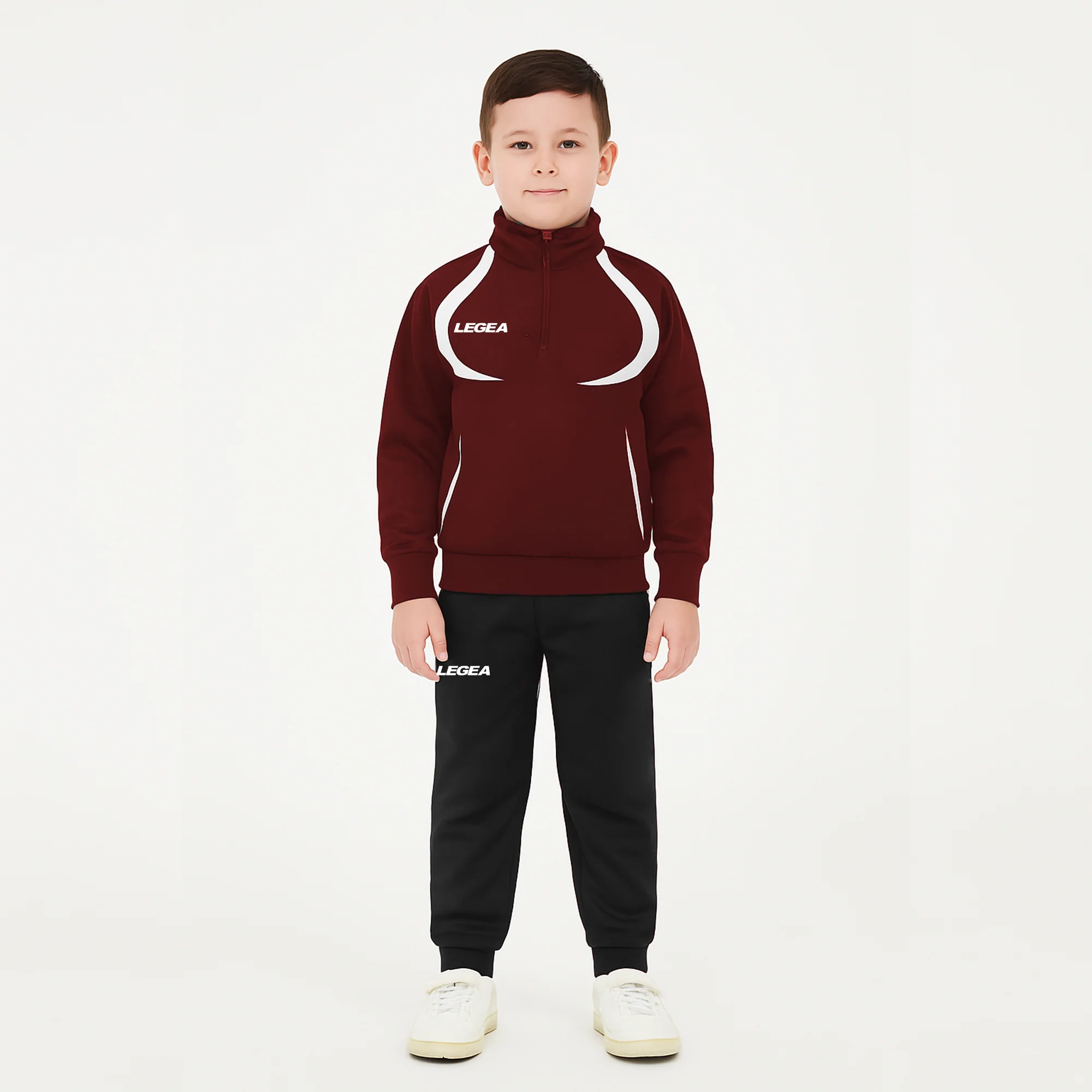 Tuta sportiva da allenamento con un design tecnico e moderno. La giacca presenta mezza zip, inserti in mesh e tessuto per favorire la traspirazione, loghi ricamati e taglio ergonomico. I pantaloni hanno comoda molla in vita, tasche laterali e fondo con polsino elasticizzato, ideali per l'attività sportiva quotidiana.